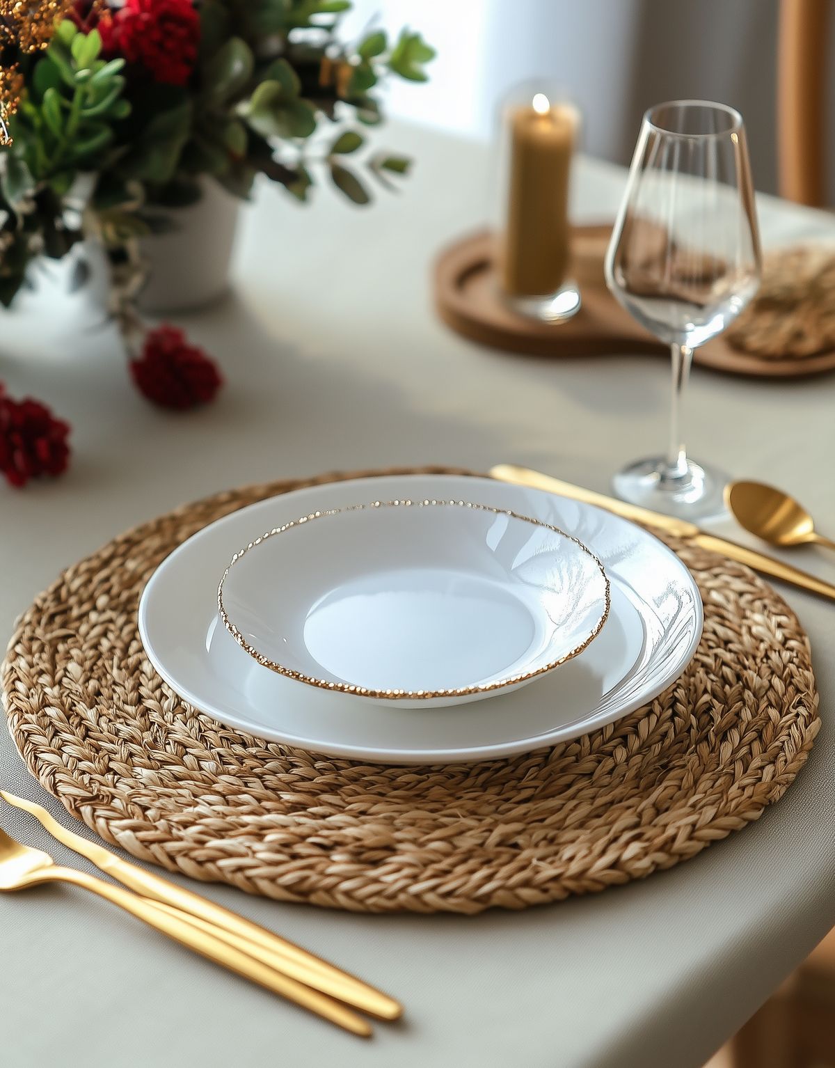 The raffia placemat stands out for its natural beauty and subtle refinement.
